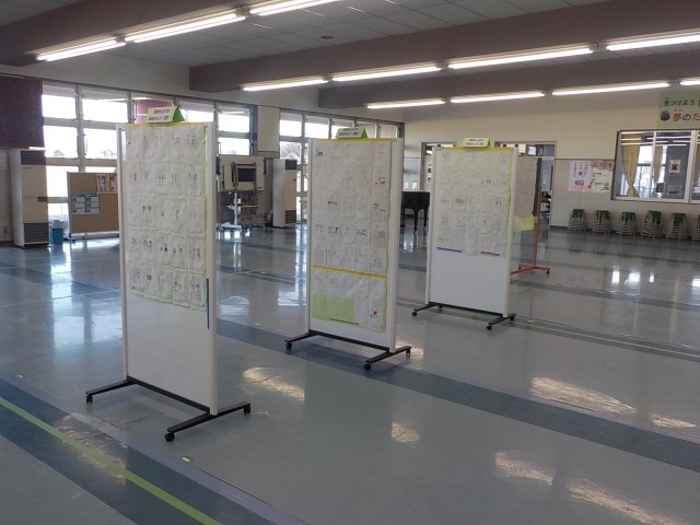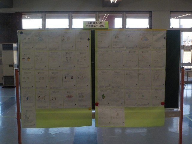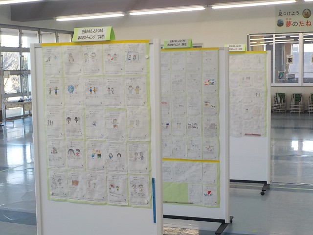 芝根小をもっとよくする「夢のたねチャレンジ」がホールに掲示されました。