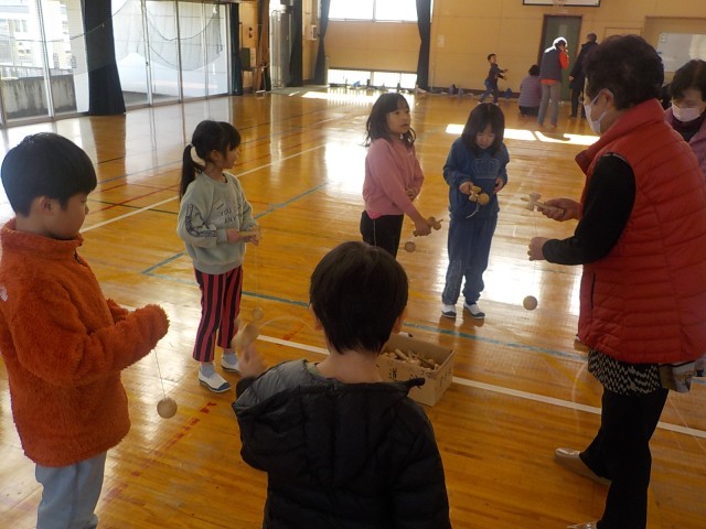 けん玉、お手玉、コマ、あやとりの4つ遊びをしました。