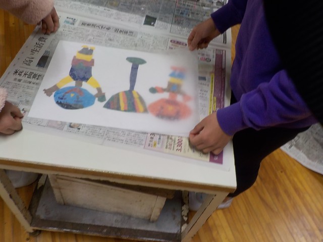 水にぬらした薄い紙を型の上に張り付けて、バランでこすると色がついた版画が完成しました。