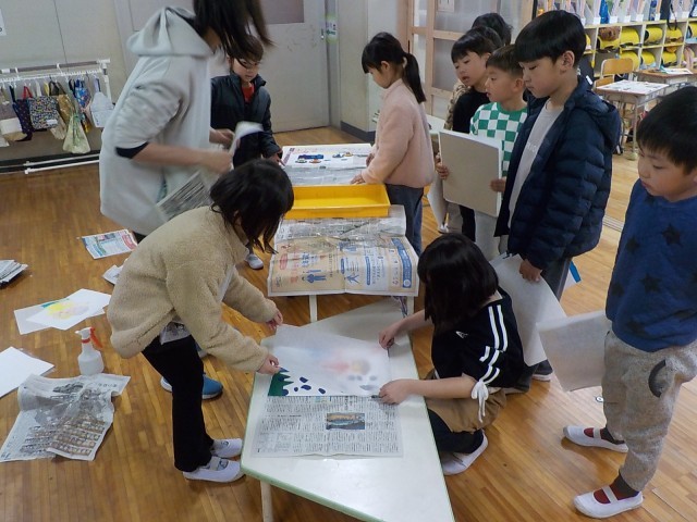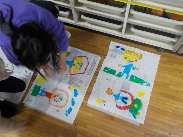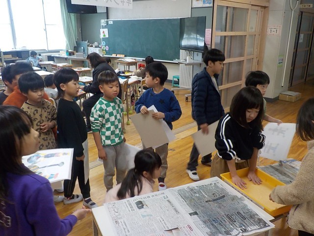1年生が図工で紙版画をしていました。