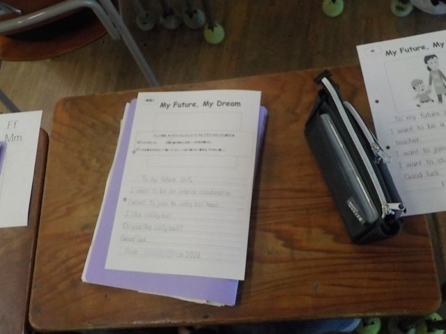 芝根小で学んだ英語をたくさん使って、「将来の夢」「中学校で入りたい部活」「力を入れたい勉強」を発表しました。