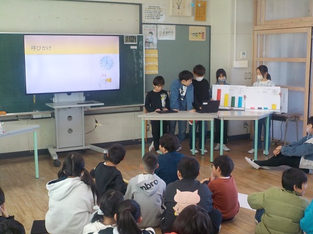 テーマ別にグループに分かれて、4年生の生活実態を調査して、その結果をまとめ、改善点などを考えて発表しました。