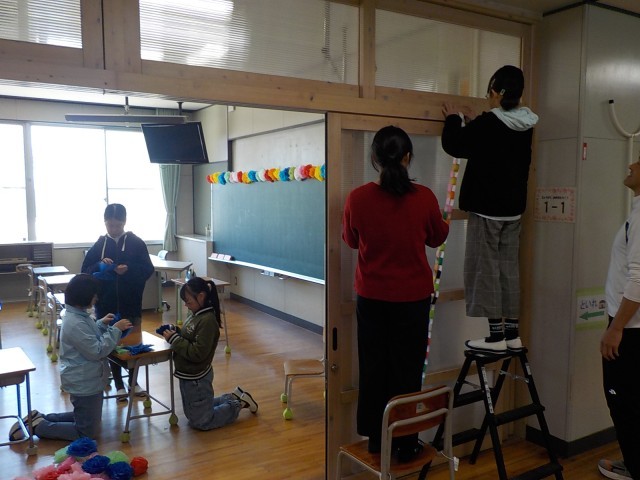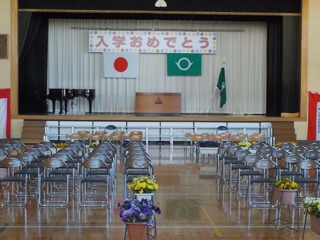 明日1年生が笑顔で楽しく登校してくれるように、体育館と1年生の教室をきれいに飾ってくれました。