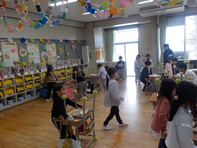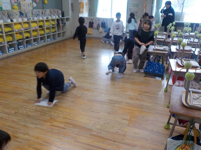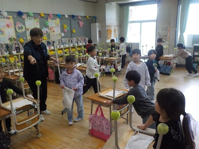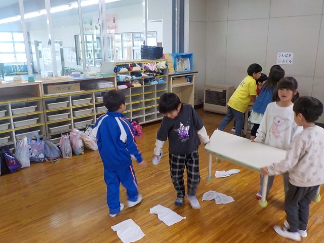 ほうき当番を先頭に雑巾当番が電車のように続きました。