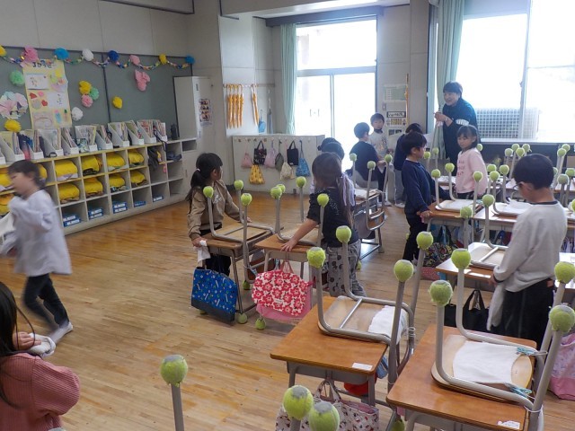 床がきれいになったら、みんなで机を運んでいました。