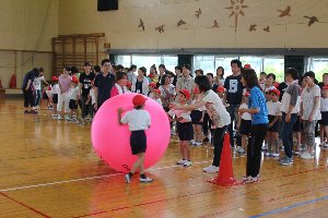 6月16日(火)学校公開の日に、2年生は親子で大きなボ−ルを使った運動に汗をながしました。町のスポ−ツ推進員の皆さんにお世話になり、キンボ−ルという競技を教えていただきました。1組と2組の2つのチ−ムに分かれて、親子が協力してボ−ルを運びます。真剣な表情あり、笑顔もありで、とても良い雰囲気の中、みんなで楽しむことができました。