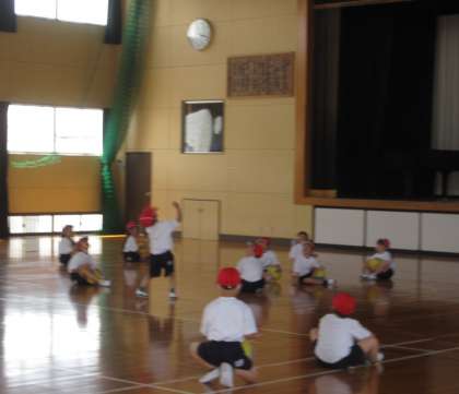 ボールを上に投げた後、ボールをキャッチする場面では、お手本となった児童がすごかったです。かなり上の方まで投げられる力、空間を把握してボールをキャッチする力に、ただただ驚くばかりでした。