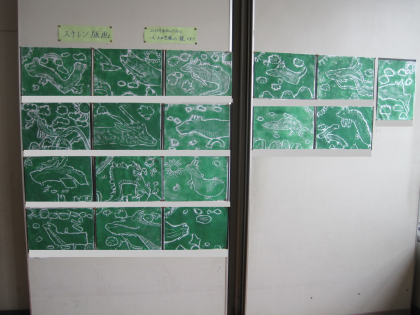 2年生のオープンスペースに飾られていた版画です。一人一人が想像した龍です。