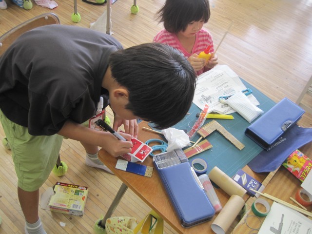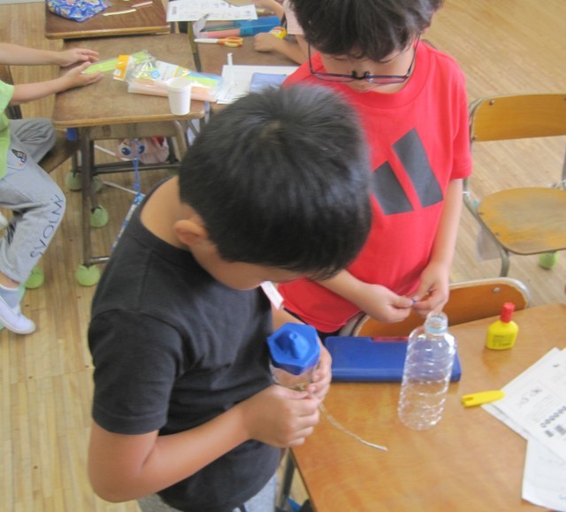 2年生の生活科でうごくおもちゃ作りをしています。空き箱やカップ、ひもやゴム、つまようじなど身近なものを使って紙の折り方やゴムの力を工夫して跳ねたり飛ばしたり回したりと、仕掛けをして動くように一生懸命作成しています。おもちゃ作りの活動を通して、もっとよく動くように、もっと楽しくなるように考えて工夫してみんなで楽しく遊びを創りだ出していきます。完成してみんなで遊ぶのが楽しみですね。