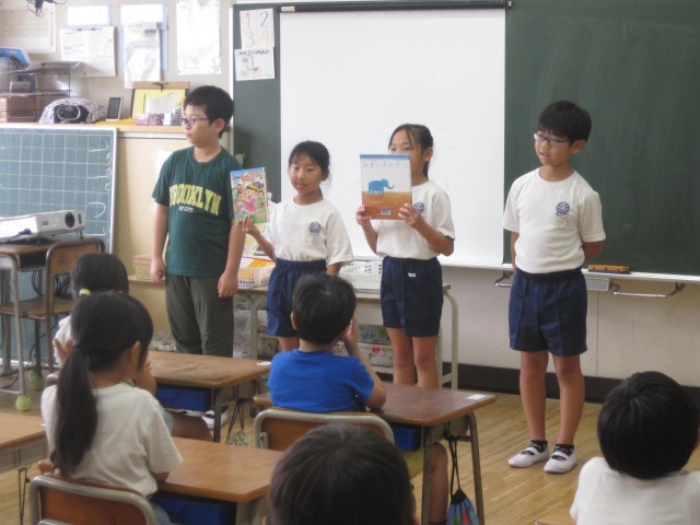 3年生は、1年生からの「おすすめの1冊を教えてほしい」という要望に応えて、国語の授業で1年生にとって楽しく、何回も読みたくなるような本を選びました。各クラス各グループで悩みに悩んで、相談して選りすぐりの「おすすめの一冊」を紹介しました。実際に「1年生に直接読んであげたい」と読み聞かせをしたり、ポスターを作って掲示したりと工夫をしながら紹介しました。1年生も興味深くお話を聴いていました。