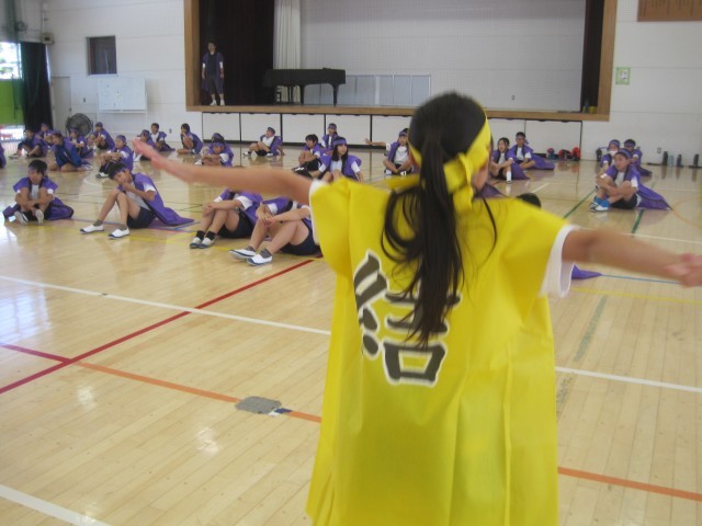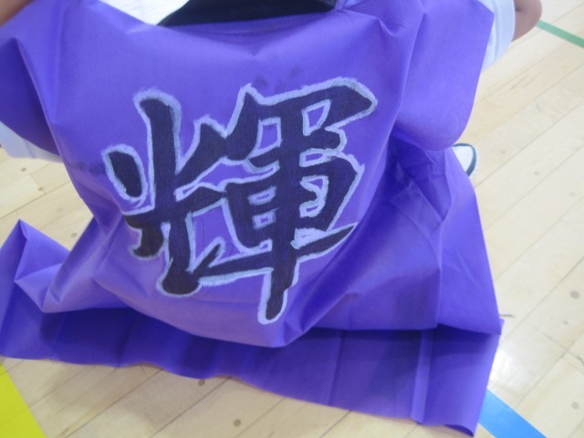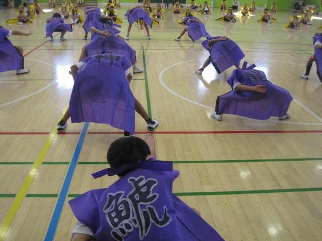 中学年ブロックの練習の様子です。気迫のあるかけ声と息づかいが聞こえてくる力強い演技です。衣装の背中には一人一人が選んだ文字を力強く描いて、それぞれの想いを込めて踊ります。お楽しみに!