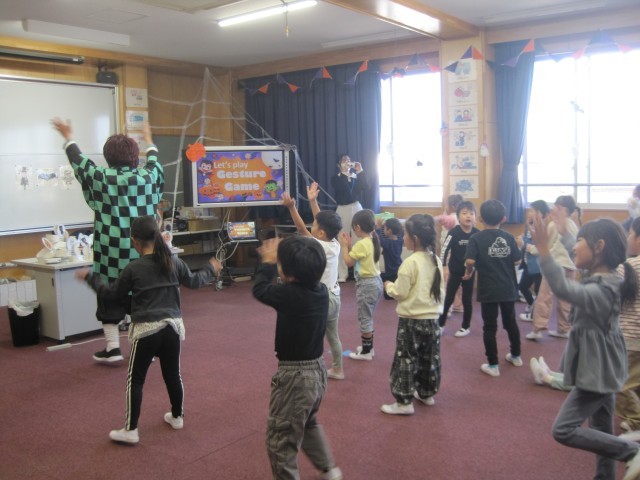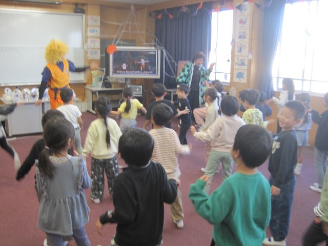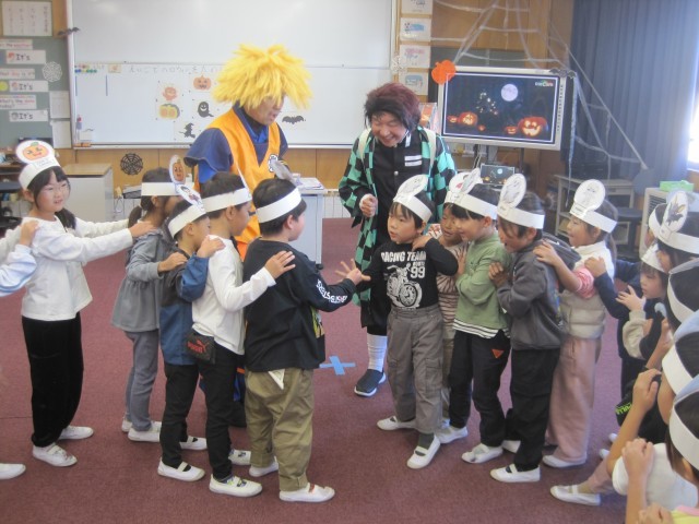 1年生の英語の学習の様子です。今日は「英語でHalloweenを楽しもう!」です。特別ゲスト?の悟空・炭治郎と一緒にクイズ、ダンス👯をしたり、じゃんけん列車をしたりして盛り上がりました!最後は「Trick&Treat」といってお菓子の代わりにシールをもらいました。大喜びの子どもたちでした☺