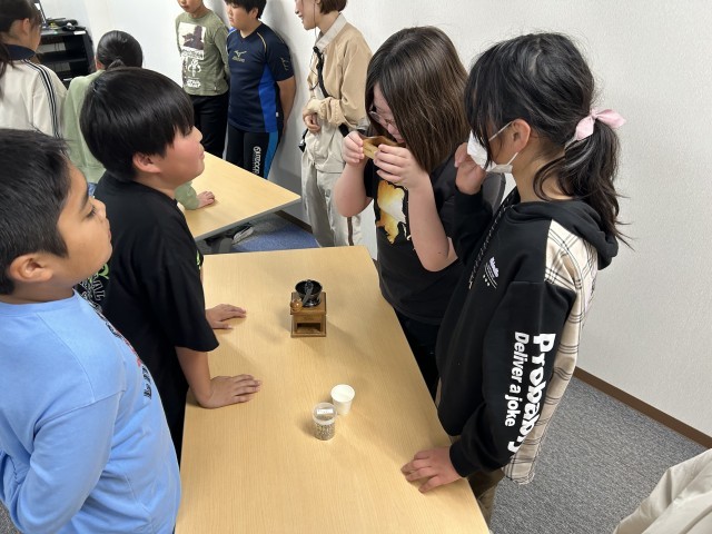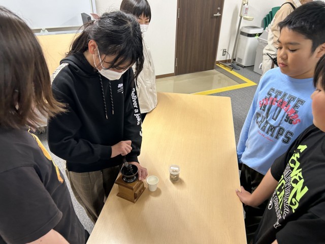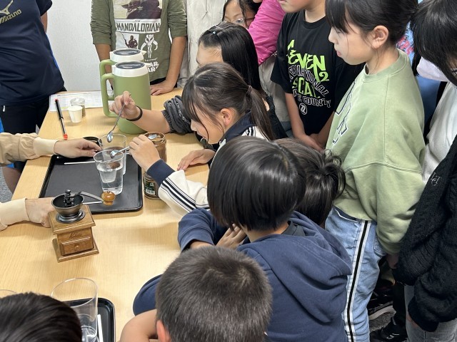 2つめの見学は、AGFの工場です。スティックコーヒーなどの製造工程を見学し、顆粒のコーヒーの溶けやすさを実験したりその仕組みを教えてもらったりしました。また、コーヒー豆の生産地、流通、環境保全活動など、幅広い内容を学びました。子どもたちは、初めてコーヒー豆をミルで挽いて、生豆と焙煎した豆、挽いた後の香りをかいで、「わぁっ、全然違う!」その違いに驚いていました。