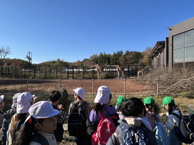 今日は2年生の遠足。埼玉県のこども動物自然公園に来ています。はじめにキリン🦒館で生まれて間もない赤ちゃんと一緒の親子をみんなで見ました。赤ちゃんだけど170cm。子どもたちは「赤ちゃんなのに大きい!」と驚いていました。その後、班別活動に元気に出発しました🦩🐱