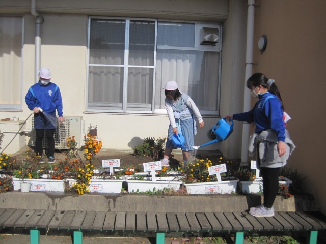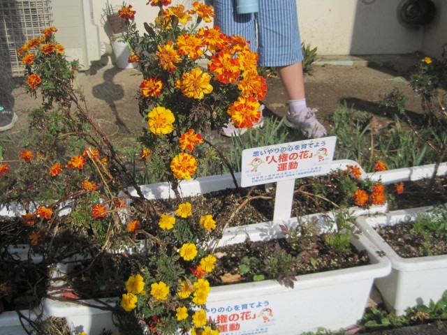 緑化委員さんがこまめに水やりをして育ててくれたおかげで、人権の花「マリーゴールド」がきれいに咲いています。夏からの長い猛暑を乗り越えて、黄色やオレンジ色が太陽の光に照らされて輝いています。マリーゴールドの花言葉には「友情」「信頼」「変わらぬ愛」「生命の輝き」などがあるそうです。