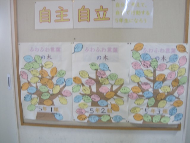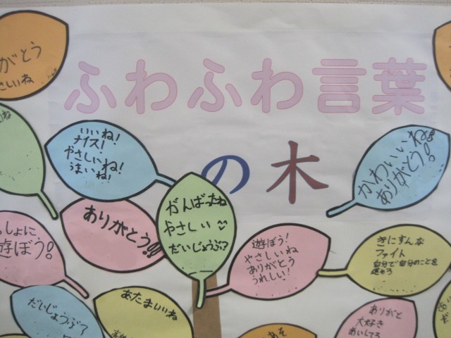各学級では、一人一人の人権意識を日常の会話から振り返るために、「ふわふわことばの木」を作成しました。子どもたちが「みんなの心がふわっと温かくなって優しい気持ちになる言葉を見つけて広げよう」と一枚一枚の葉を作り、みんなで完成しました。
