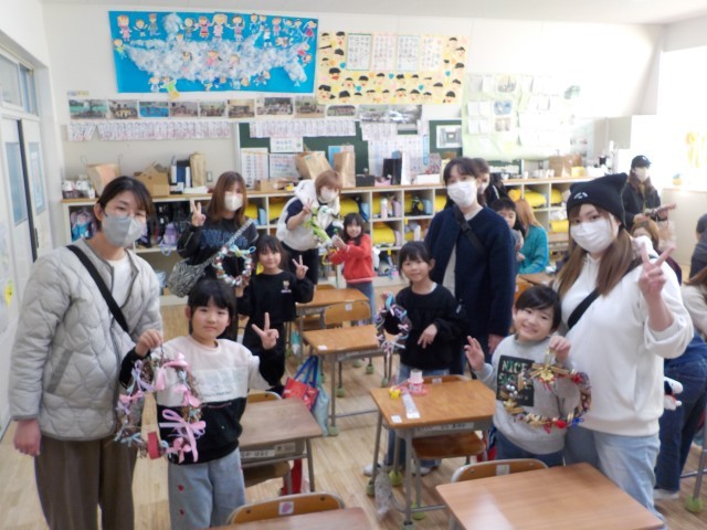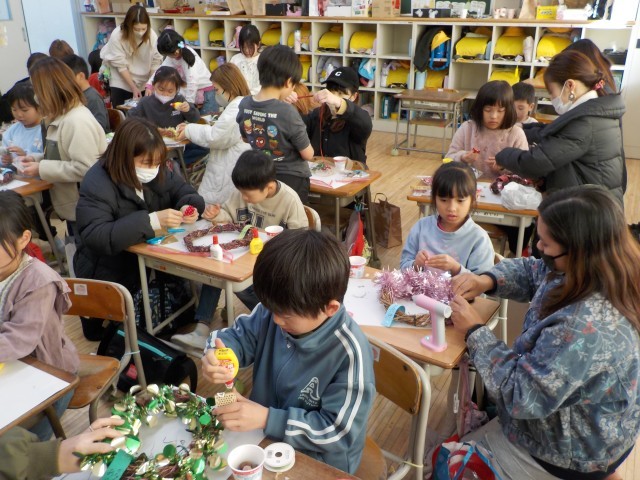 1年生は夏の間丁寧に育ててきたあさがおのつるをはずしてリースの土台を作り、群馬の森で拾ってきた松ぼっくりやどんぐりを使って、クリスマスリースを完成させました。おうちの人にも一緒に参加していただき楽しく活動できました。それぞれオリジナルの作品ができたので、家で飾って楽しんでほしいと思います。