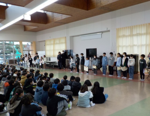 終業式では、書道やポスター、読書感想文などの表彰、冬休みの生活や交通安全についての話がありました。