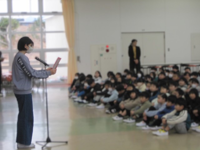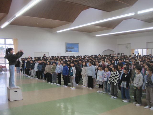 今日は3学期始業式。少し気温が低く、休み明けモードで登校した子どもたちも、教室に入るとみんな元気はつらつ友達と笑顔ではしゃいでいました。始業式では、6年生と一緒に歌う最後の校歌とうことで、より一層大きな声が響きわたり、6年生が口を大きく開いて一生懸命歌う頼もしい姿にも感動しました。