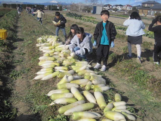 3年生は総合的な学習の時間で、玉村町の地場産野菜を中心に玉村町の魅力を発信する活動を行っています。今回は学習の一環として、五常ファームさんのご厚意でだいこんの収穫体験をさせていただきました。畑に育っているだいこんを引き抜いて満足そうな笑顔の子どもたち。大きな大きなだいこんに驚きと喜びがとまらず、「見て見てーとれたよー!こんなに大きいのがとれた」「おもしろい形のだいこんがでてきた」「だいこんに長いひげがはえてるよ」などの声が聞こえてきました。実際に収穫するからこそ学べることがたくさんあります。生産者さんの苦労を知り、食への感謝の気持ちをもつことで、今後のよりよい生活、成長につなげられると思います。この体験を生かして、子どもたちは総合の学習で自分たちの住む玉村町の野菜の魅力を伝える取組を具体的にしていきます。どんな発信になるのかとても楽しみにしています!