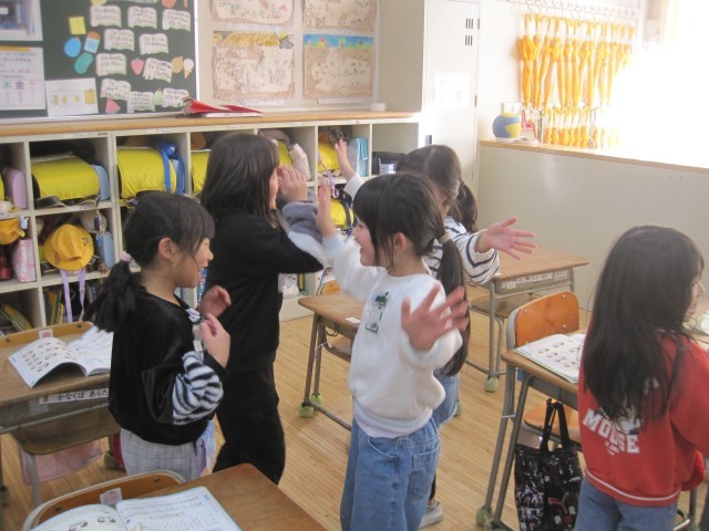 1年生の教室でとっても楽しそうな歓声があがっているので、見に行ってみたら懐かしい「おちゃらか ほい」で繰り返しいろんなお友達と大盛り上がりの子どもたち。音楽で日本のわらべうたで遊びながら歌う学習でした。終わりの時間がきても、「もっとやりたい~。「「あー楽しかったあ」と大満足の表情でした。時代を超えて、わらべうたで遊びながら交流している子どもたちの姿に心が和み嬉しい気持ちになりました♡