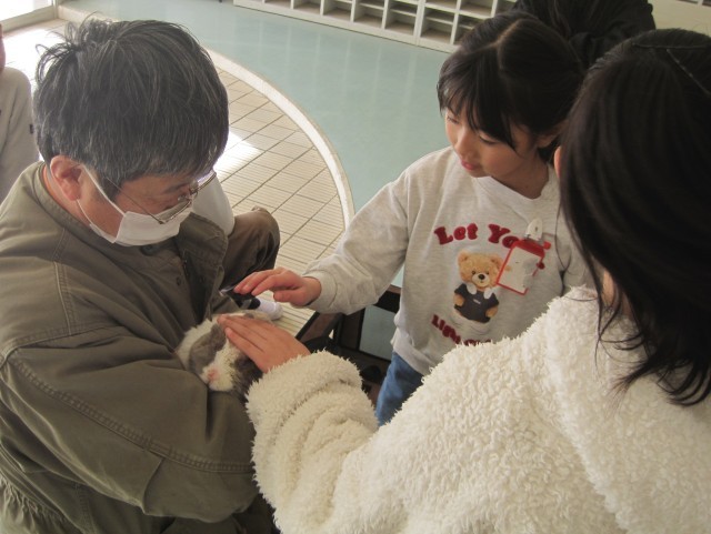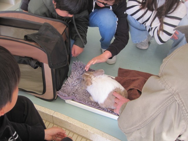 今週は、飼育委員さんが企画したうさぎの空くんとのふれあいweek期間です。飼育委員をサポートして、毎日高齢のうさぎの空くんのお世話をお手伝いしてくださっているうさぎボランティアさんが、家に連れて帰ってくれたり学校に連れてきてくれています。今日は風がとても強かったので、中央玄関でふれあい活動をしました。集まった子どもたちは順番に「毛がふわふわだね」「あったかい」「かわいいね」声をかけながらみんな優しい表情でそっと撫でていました。うさぎの空くんに触れて命の大切さを感じるひとときでした。