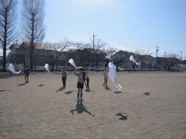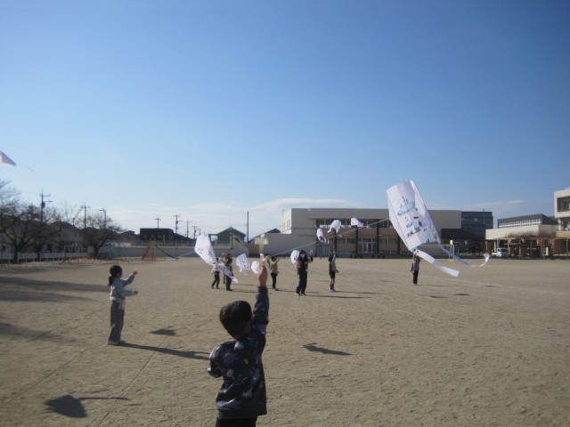 1年生は、図工の時間に自分で絵を描いた凧をあげました。今日は弱い風でしたが、タイミングをみて風にのせてあがった時は、「わあっ上がったよ。みてみて~!」と歓声があがっていました。風の吹く方向や抵抗、糸の長さや引っ張り具合の調整、友達の凧と絡まないような距離感など、体験しながら色々なことを学びます。