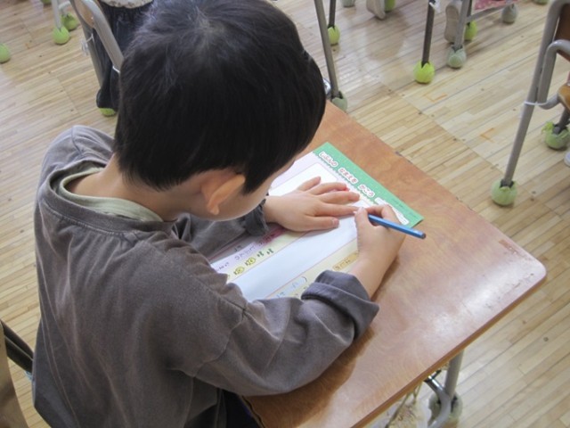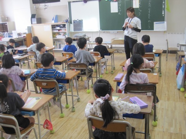 1年生の学習が始まりました。グーペタピンの姿勢で、自分の名前を書くことについて、先生の話を聞いています。