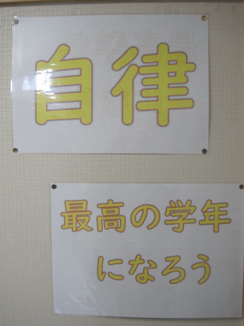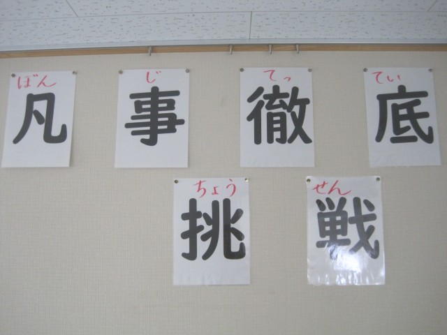 6年生の廊下には「自立」「最高の学年になろう」という掲示物、5年生の廊下には「凡事徹底」「挑戦」という掲示物が掲げられています。