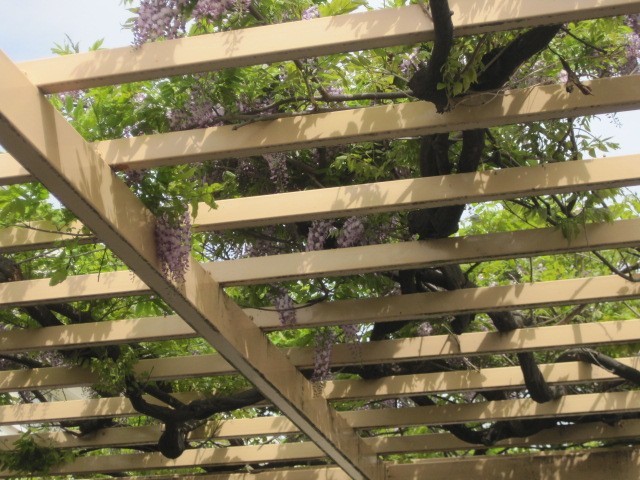 藤棚を見上げると、藤の花がきれいに咲いています。短く剪定したことで、たくさんの花を見ることができます。