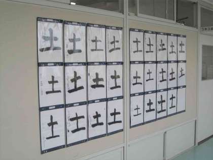 廊下には、書写の時間に書いた「土」の毛筆作品が掲示されています。3年生になると、書写で毛筆の学習を始めます。「土」は縦画と横画のバランスが難しいのですが、子供たちは頑張って書きました。