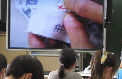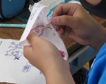 5年生 家庭科(裁縫) 公開日 2020/07/09 更新日 2020/07/09 学校日記 5年生は家庭科で手縫いの練習をしています。 教師の手元が見えるように大型の電子黒板を使って、玉どめの方法を指導しています。 5年