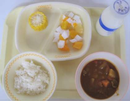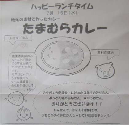 「今日は年に一度の玉村カレーです。今年で14回目になりました。玉村カレーに使われる「たまねぎ」は芝根小学校3年生の皆さんが、2年生のころから農業委員さんとともに植え付けをして育ててくれたものです。豚肉とお米、じゃがいもも玉村産です。玉村のめぐみがたっぷりつまった給食です。玉村のめぐみに感謝していただきましょう。」
