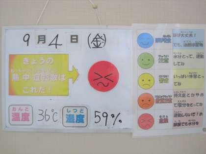 毎日、熱中症チェッカーを使って熱中症指数を測定しています。測定した結果は保健室前の廊下のホワイトボードに報告されます。