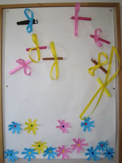 廊下の掲示板に飾られています。 トンボとコスモスです。もうすぐ秋ですね。