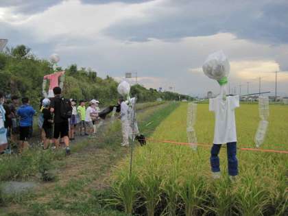 9月18日、5年生は稲の生育状況の観察とかかしの設置のために、田んぼに出かけました。かかしはクラス毎に自分たちで作りました。