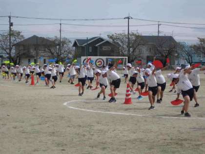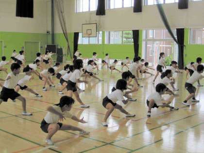 体育学習発表会に向けて頑張っています。 写真は、6年生と4年生です。