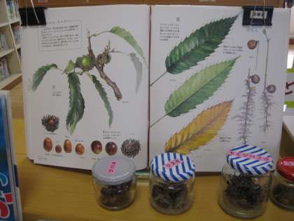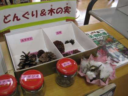 今週の図書館には、いろいろな木の実が飾られています。
