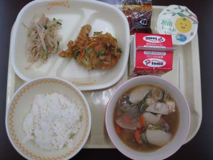 11月2日(月)の給食メニューは「ごはん、牛乳、しらすかき揚げ(天丼のたれ)、だいこんともやしのごまあえ、けんちん汁、湘南ゴールドゼリー」でした。