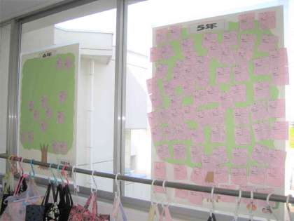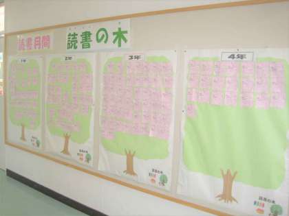 読書月間の取組として、中央小では「読書の木」を図書館前の廊下に掲示しています。図書館の本を5冊読んだら、りんごカードをもらいます。一番心に残った本の感想をカードに書いて、学年の木に貼ります。一番多く実をつけるのは、どの学年でしょうか。(図書館だより たからじま 11月号より)