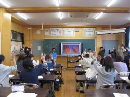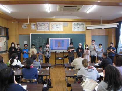 学校保健委員会では、最後にみんなで一緒に音楽に合わせて手洗いのやり方を練習しました。