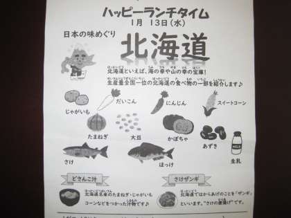 給食 公開日 2021/01/14 更新日 2021/01/14 お知らせ 1月13日の給食は、味めぐり「北海道」メニューでした。 「わかめごはん、牛乳、さけザンギ(からあげ)、ブロッコリーのごまあえ、どさんこ汁」をおいしくいただきました。