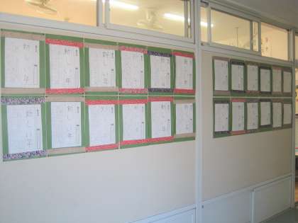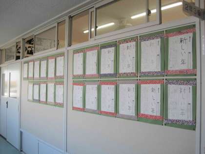 2年生の教室の廊下には、硬筆の書き初め作品が飾られています。