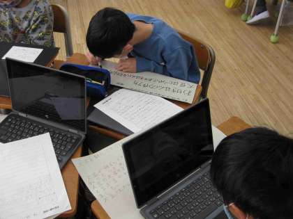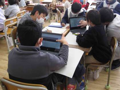 3年生は、総合的な学習の時間に「大豆について調べよう」をテーマに学習しています。各自が興味をもったことについて調べて発表します。調べ学習には図鑑やタブレットを使っています。