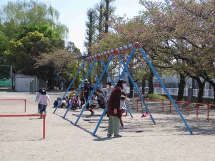 1年生は学校生活三日目に、校庭の遊具の使い方やウサギ小屋について勉強をしました。