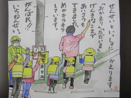 1年生の下校の様子と温かいメッセージの「絵手紙」を滝本志津江様よりいただきました。