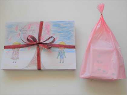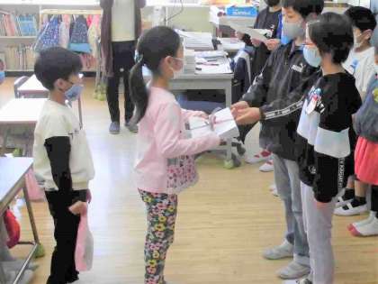2年生と4年生の代表と児童委員の子が1年生の教室に行ってプレゼントを手渡しました。