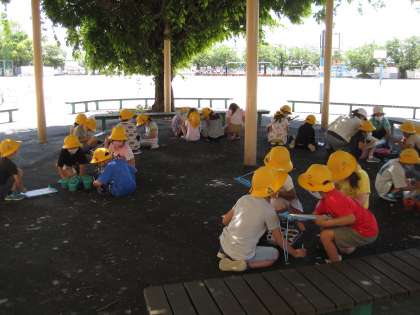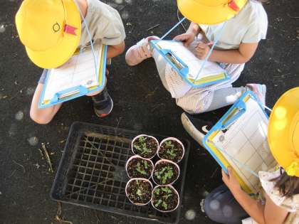 種から小さな芽が出ました。どんな形をしているか、みんなで観察しました。