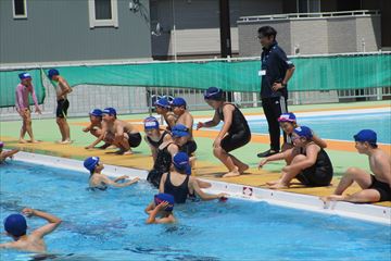 子供たちが安全に学習できるように、4年生は中心に指導する先生1名とプールサイドで監視する先生3名で対応しています。