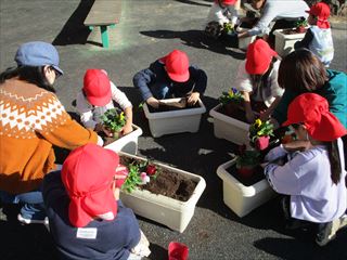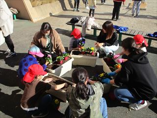 保護者の皆さんと一緒にプランターにパンジーを植えました。